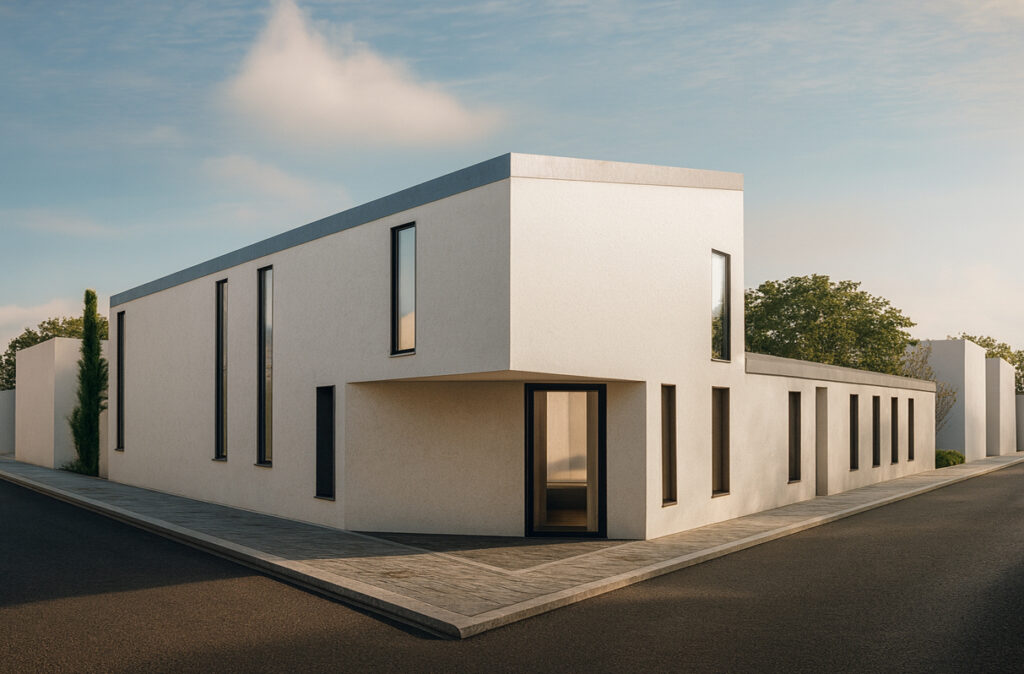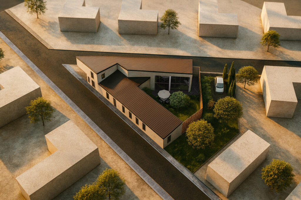 Architectural study of a corner house with a triangular floor plan, naturally shaped by the geometry of the street. By folding the volume, a sheltered patio emerges — a quiet green courtyard forming the heart of the house. Two wings arranged in a “V” open the interior to sunlight while maintaining privacy from the public space.