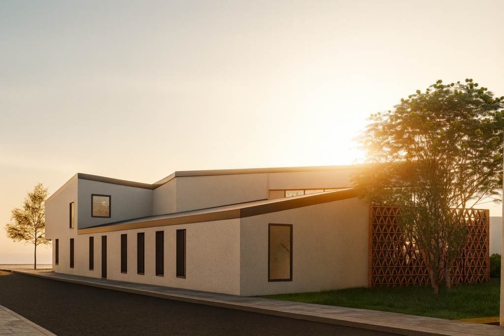 The study was developed in response to the client’s specific requirements, emphasizing privacy, natural light, and the efficient use of an atypical corner plot.