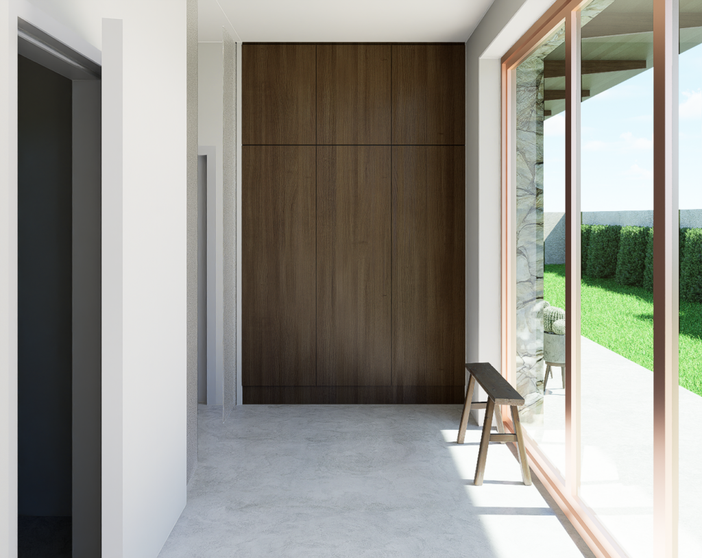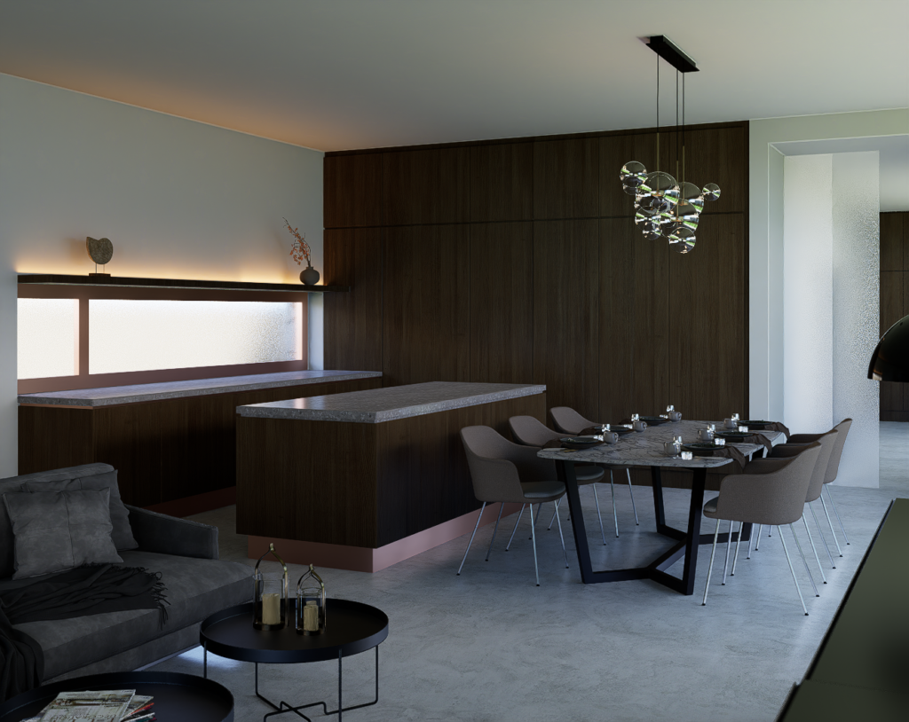 The interior blends raw materials – concrete, wood, textured glass – with soft light and balanced tones.