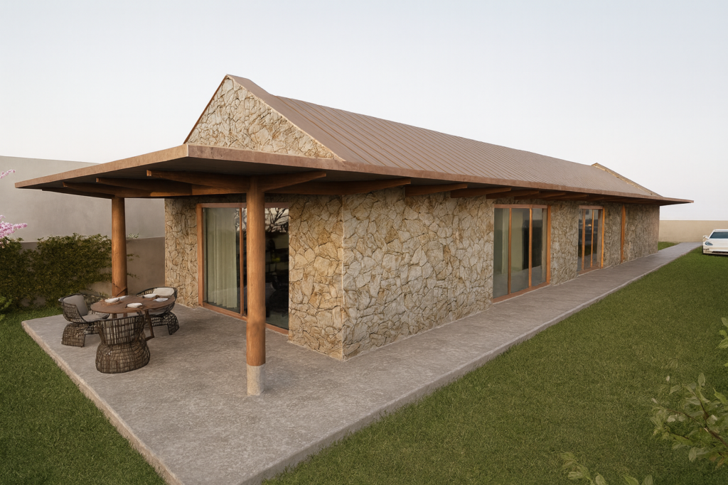 Outdoors, a continuous stone façade and covered terraces form a calm, monolithic presence that comes alive at dusk under warm architectural lighting.