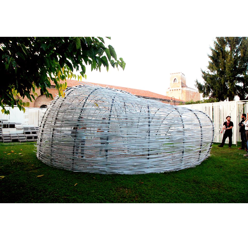 The workshop used contemporary and locally produced economical materials, such as wires, metal nets and PVC pipes. The pipes are bent to create arches that guarantees zero impact, as well as a temporary environment for the fragile Venice Biennale venue. PVC was chosen for its flexibility, which allows several possible and flexible forms.