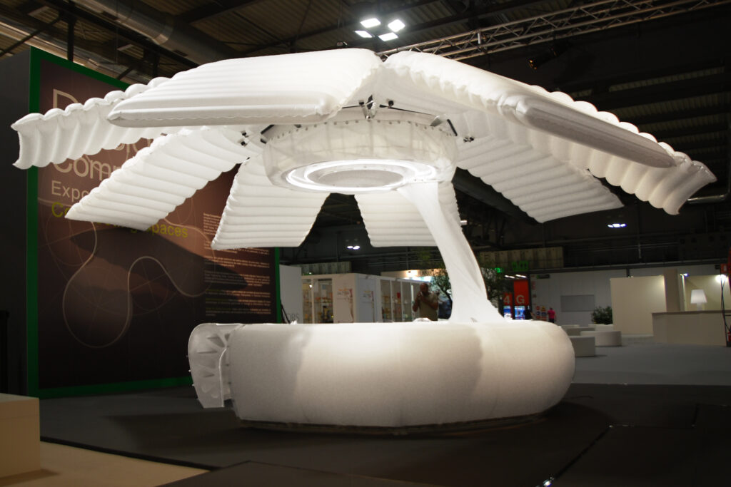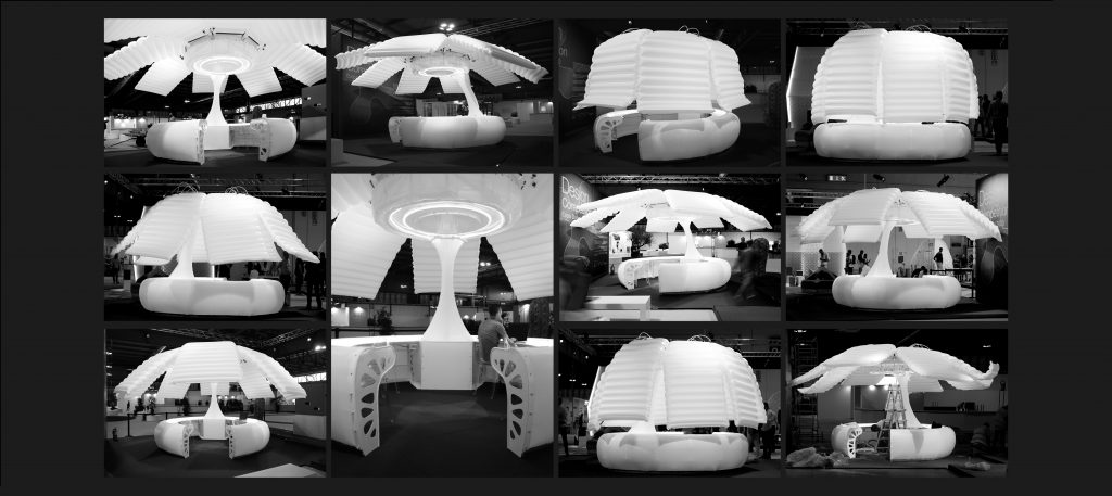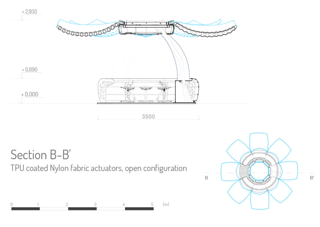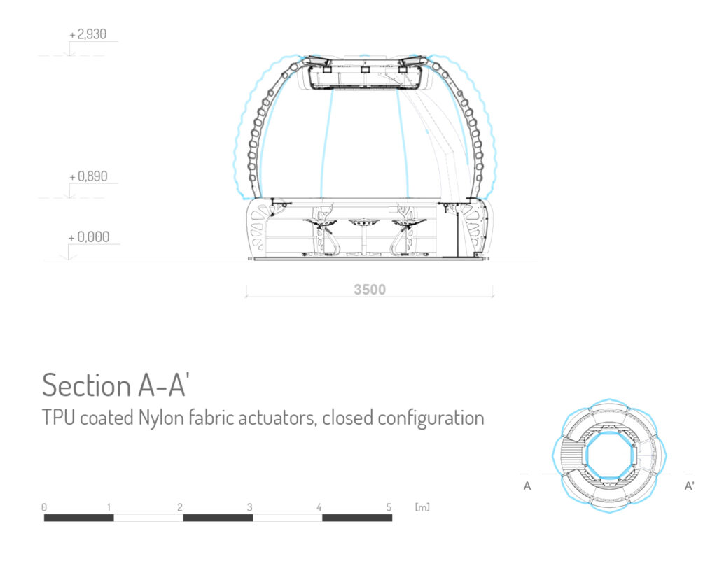 The main body consists of a modular steel structure that is enclosed by an innovative soft-robotic skin that is able to adapt to changing outdoor conditions, creating a hybrid between indoor and outdoor. The dimensions of the circular pod are 3.5 m in diameter and 2.93 m in height and it is made of a modular steel structure (consisting of 6 table modules and one demountable column module that includes a base, a column, and head pieces) covered with TPU coated Nylon fabric. The pod is featuring a kinetic inflatable envelope system made of 8 ‘petal’ modules of welded 3-layer TPU coated Nylon fabric cushions, 349 cm long and 64 cm and 144.5 cm wide at their ends when deflated.