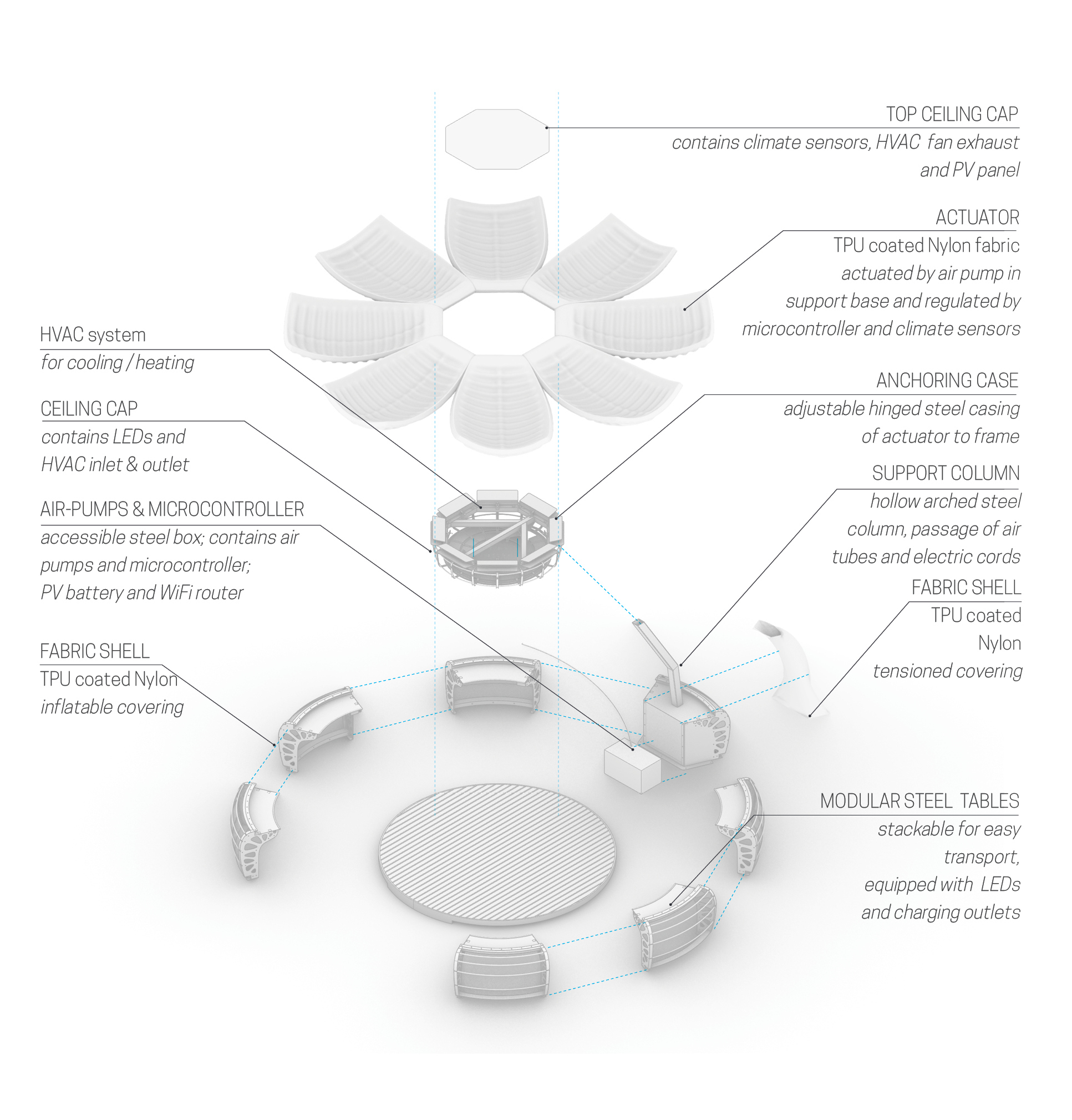 The actuators are fixed to the structure using eight folded steel supports which are radially fixed with hinges to the top octagonal frame of the pod, supported by a curved beam cantilevered from the steel base. A pneumatic system connects two air pumps located in the base with each side of the eight actuators, enabling the control of all bottom or top sides of actuators. The column base is strategically positioned on the perimeter of the space, freeing up internal space for collaborative interactions between the users. The pavilion is also equipped with an electric circuit that provides the power distribution to the LED lights and the connection between the sensors the data logger and the controlling system. A tensioned TPU coated Nylon fabric cover gives the column and tables their curvy look.