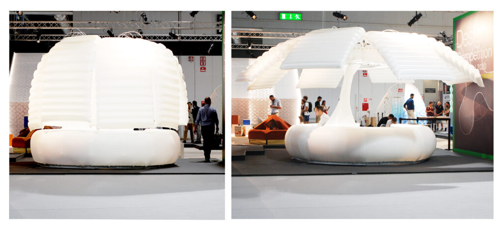 This prototype is the outcome of an independent research project into soft-robotic responsive envelope systems, aimed to create a new, lightweight, adaptive envelope typology to provide increased comfort and an energetically efficient solution for outdoor living and working. Soft robotics is an emerging field in robotics that takes inspiration from invertebrates that are able to move without any rigid body parts. Emulating those biological mechanisms provides significant advantages over traditional rigid robotics, such as reduced weight, cost, and increased robustness and flexibility. The pod was to provide a comfortable, covered outdoor space with workstations for 6 people, fully equipped with LED lighting, charging spots, Wi-Fi, and a climate control system, while aspiring to reduce grid dependency.