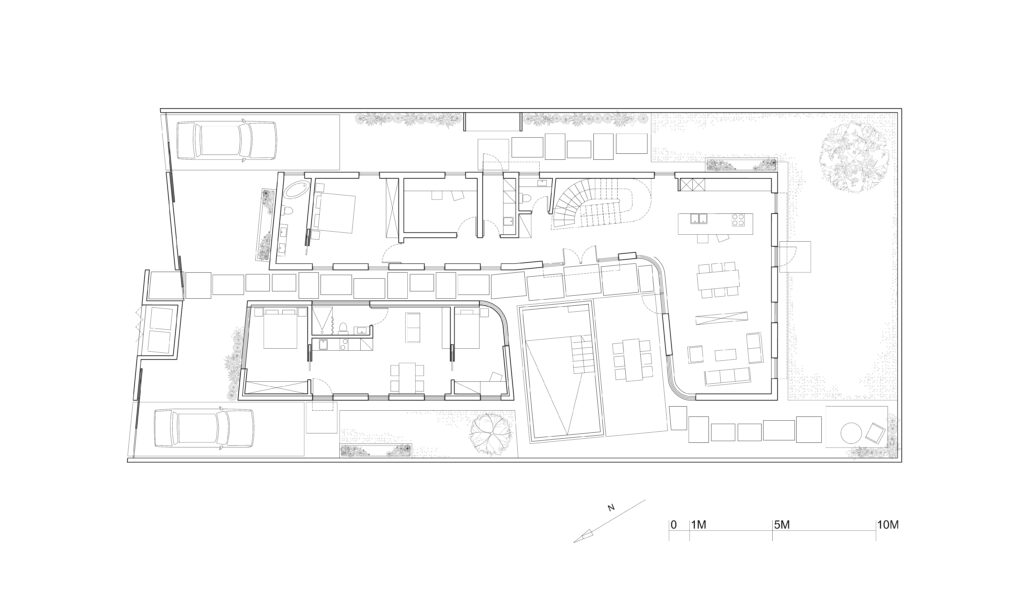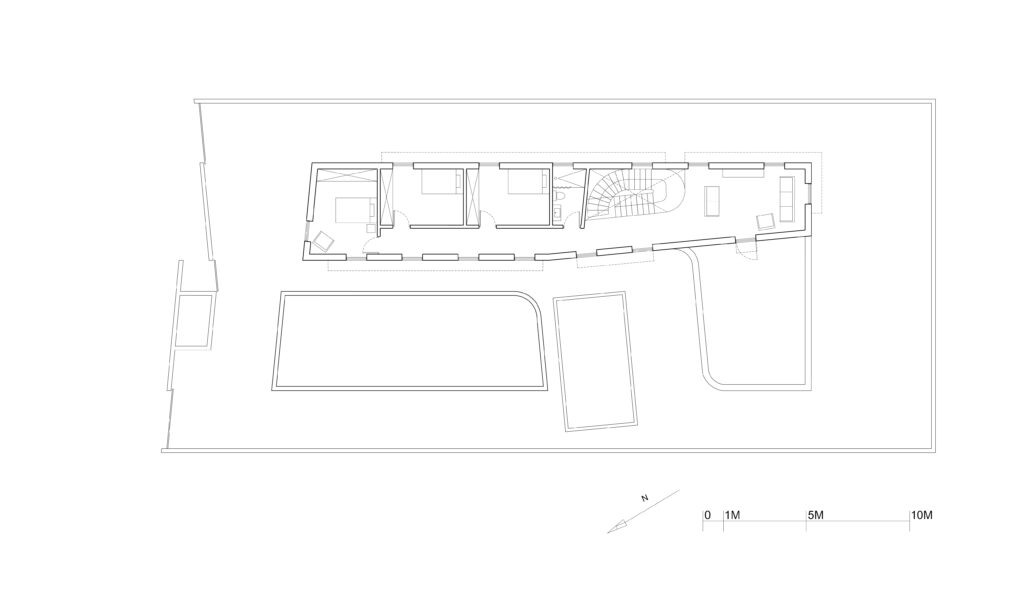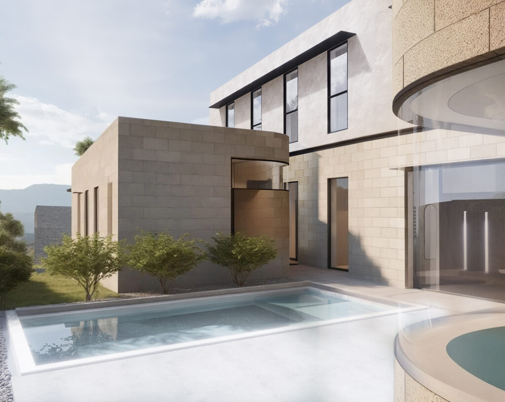 At the core of the residence, we cleared a small private patio space around which the two parts of the house are strategically positioned. This area houses the main entrance to the residence as well as the swimming pool, contributing to a sense of a small hidden oasis.